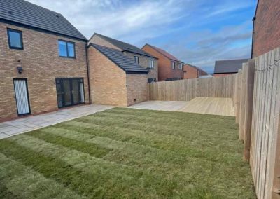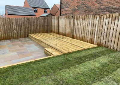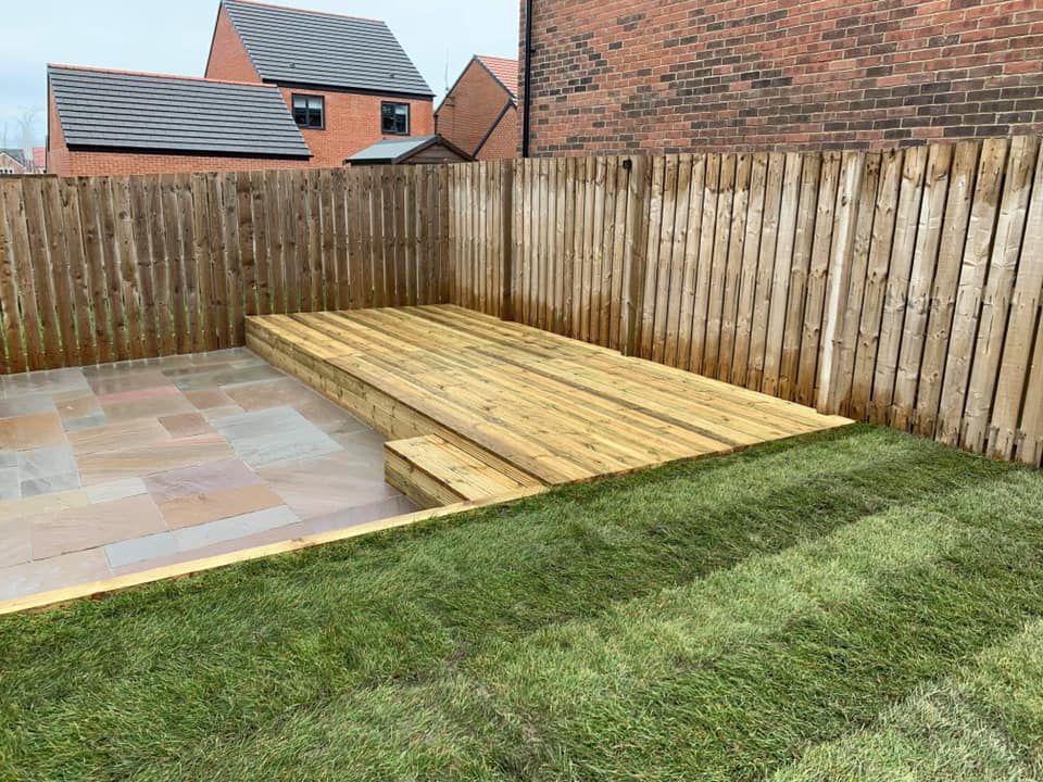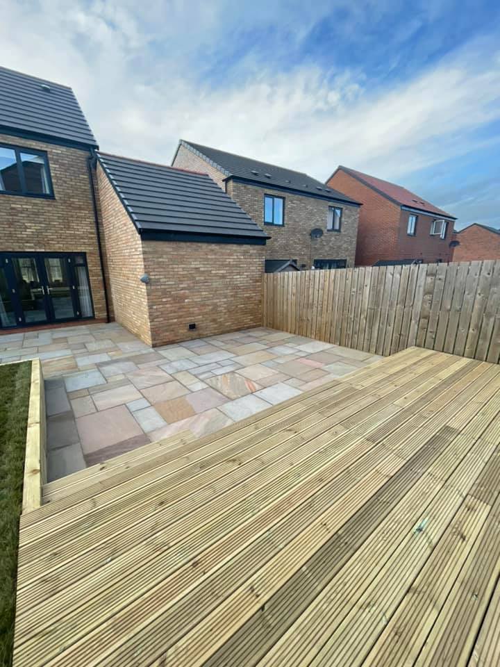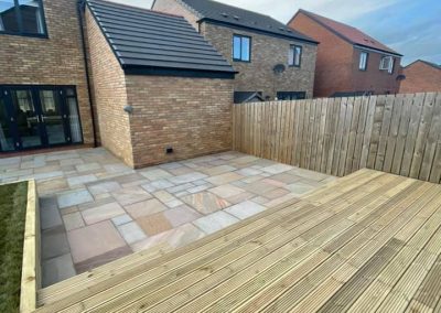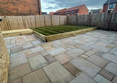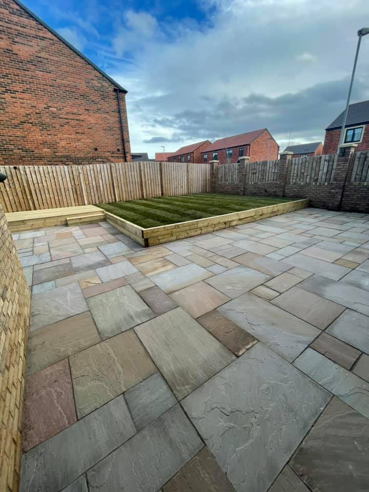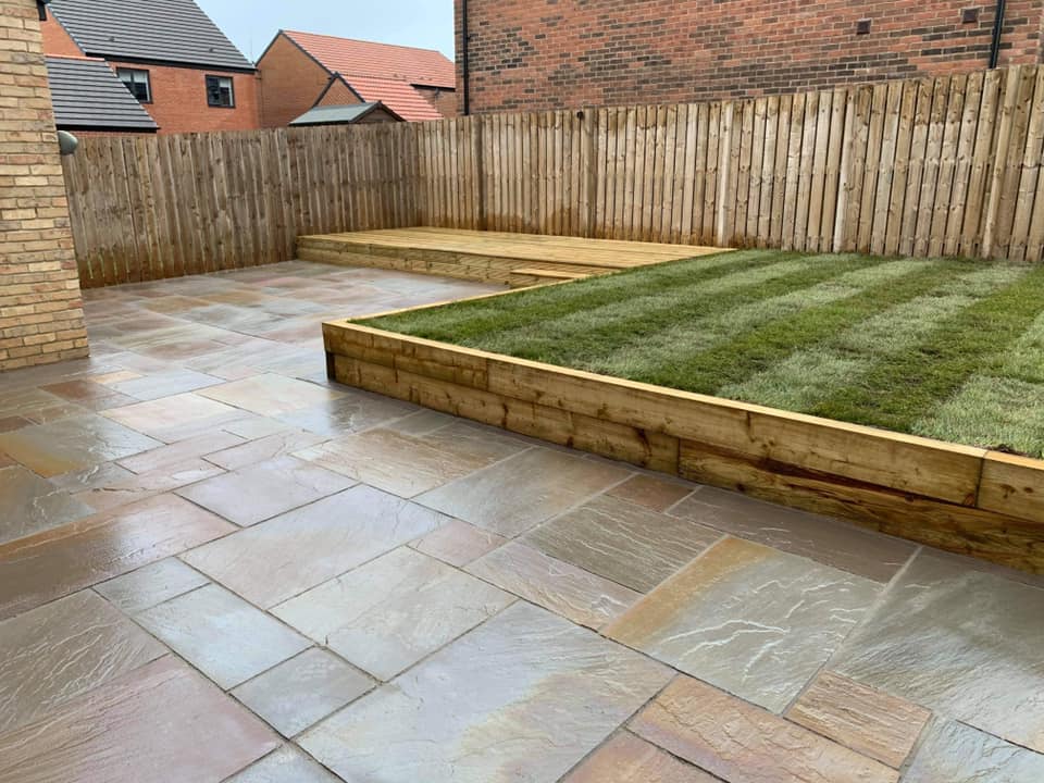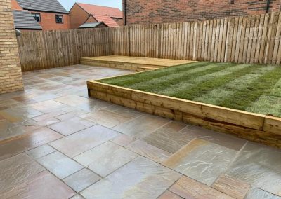 Here we have our most recent finished garden transformation, the lads have done excellent battling with the weather constantly! Some lovely sandstone paving, a raised lawn retained by sleepers, with a nice bit of decking in the far corner, all finished to a very high standard, well-done team!