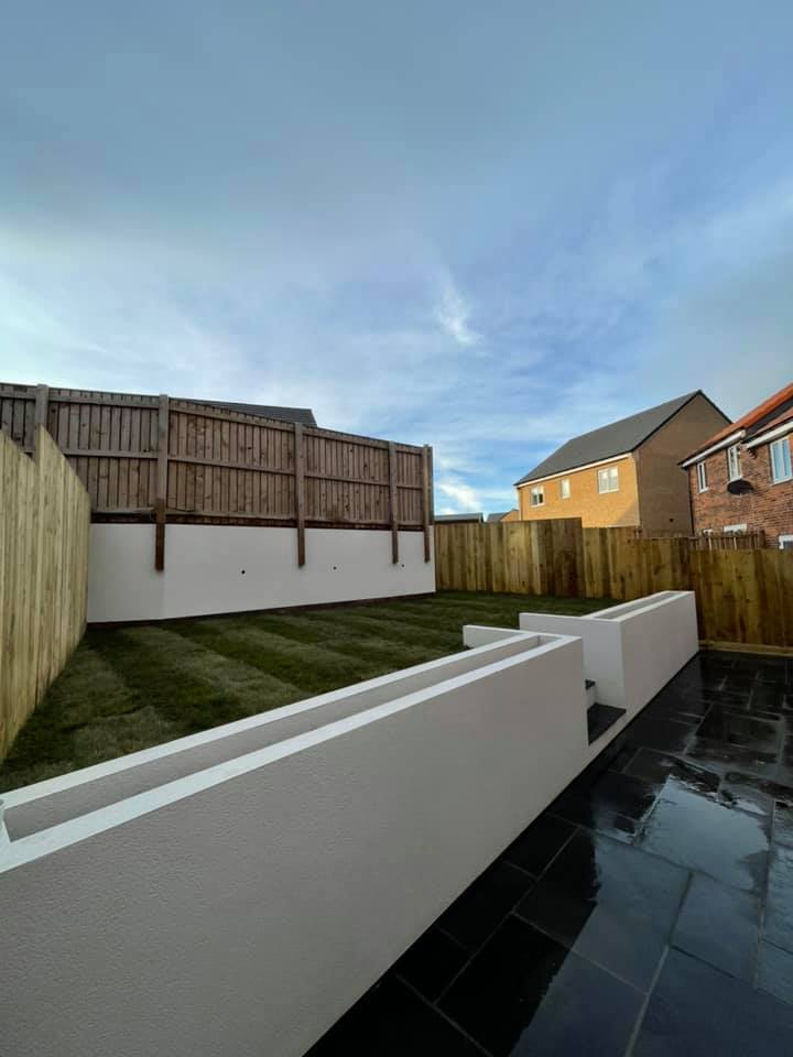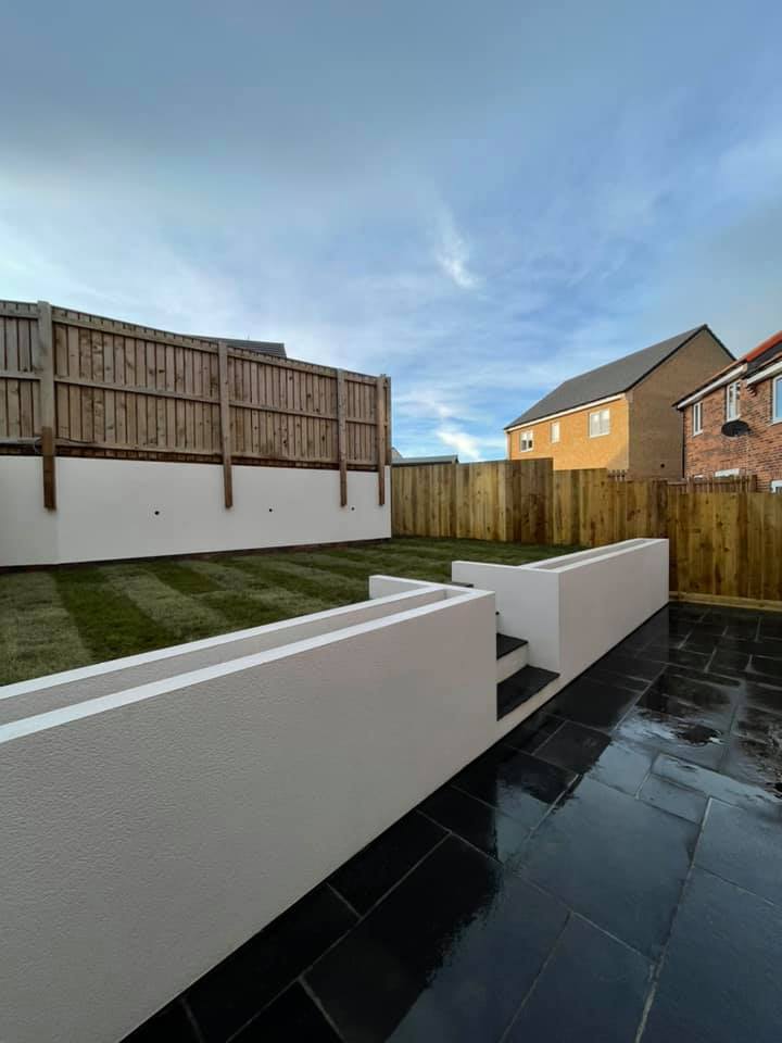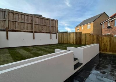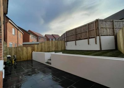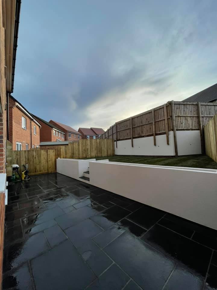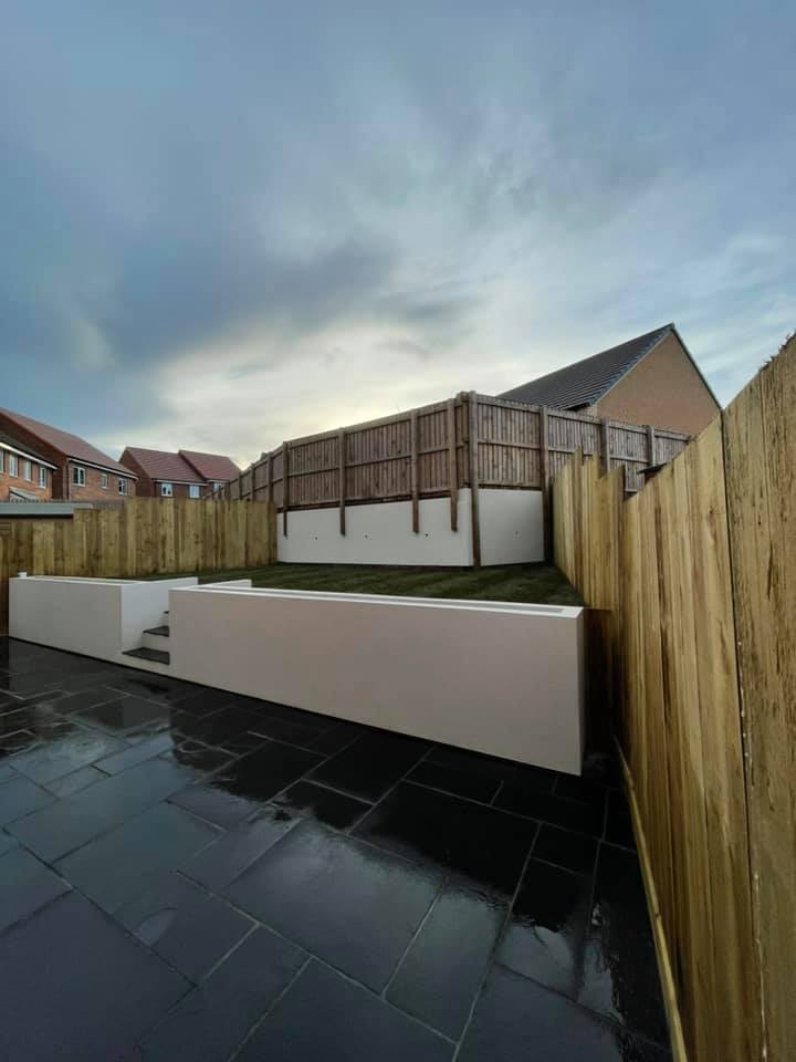 Another full garden transformation by the MIDD Construction team! Everything is done by our in-house skilled tradesmen! The complete package! Brilliant white rendered retaining wall, freshly laid turf, with grey sandstone paving to finish on the bottom patio, with 6ft fencing either side of the property.