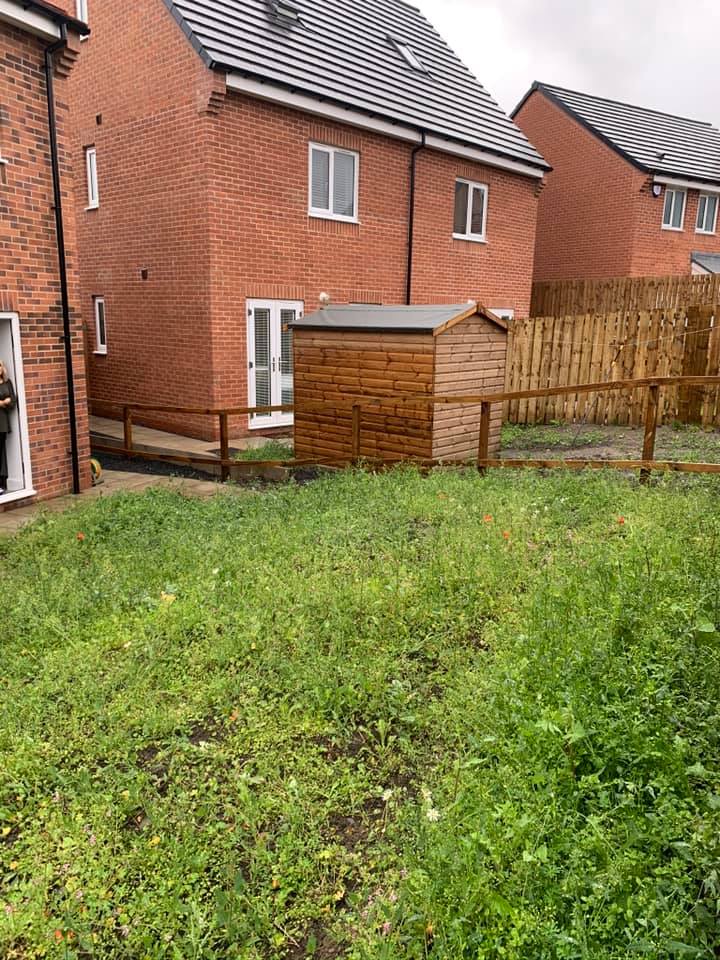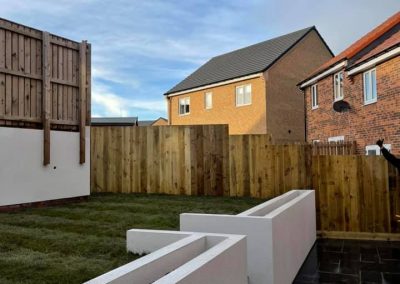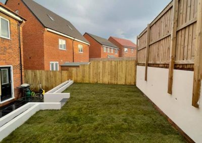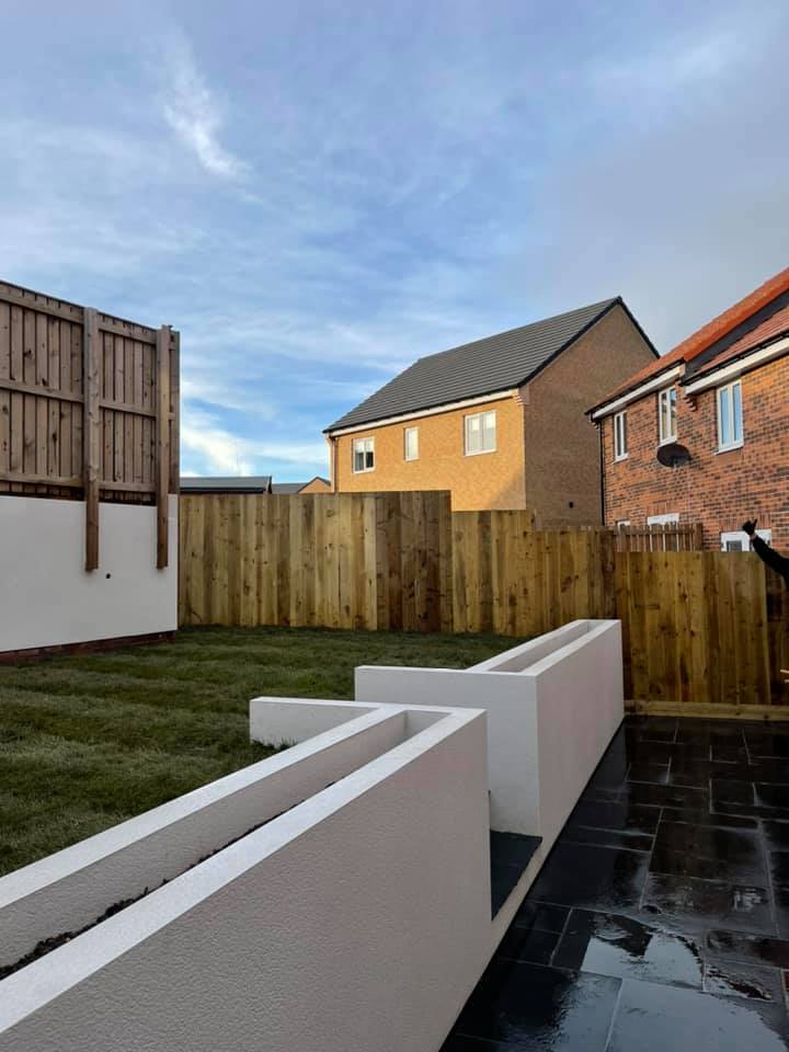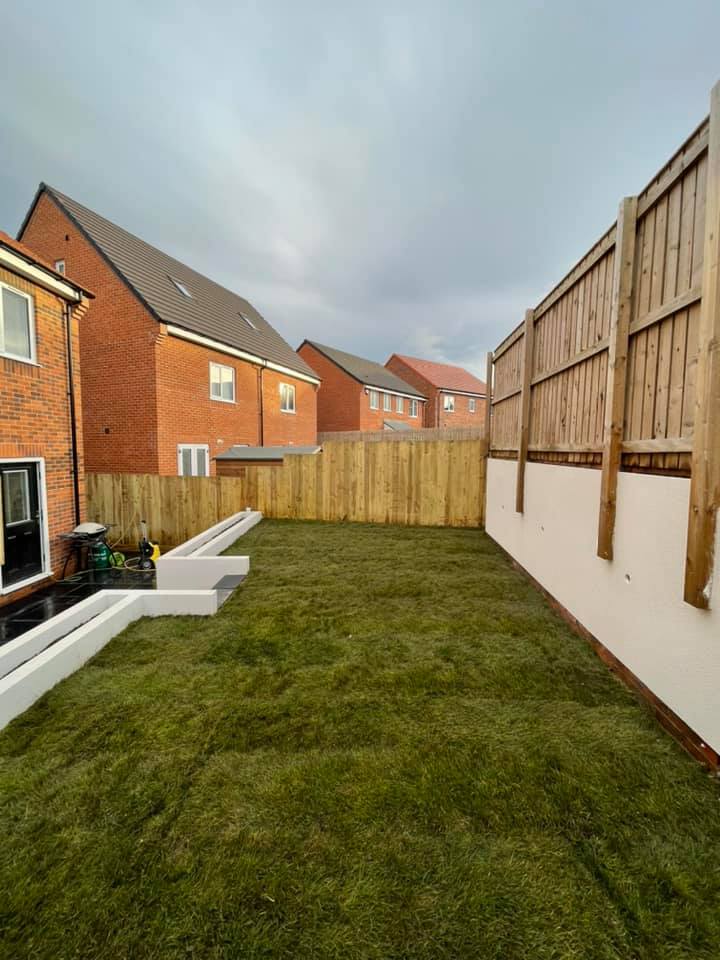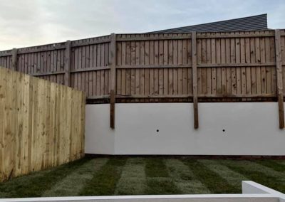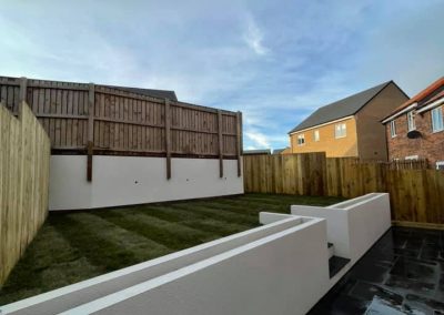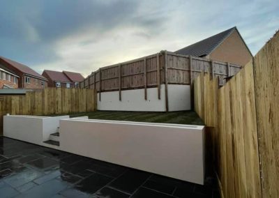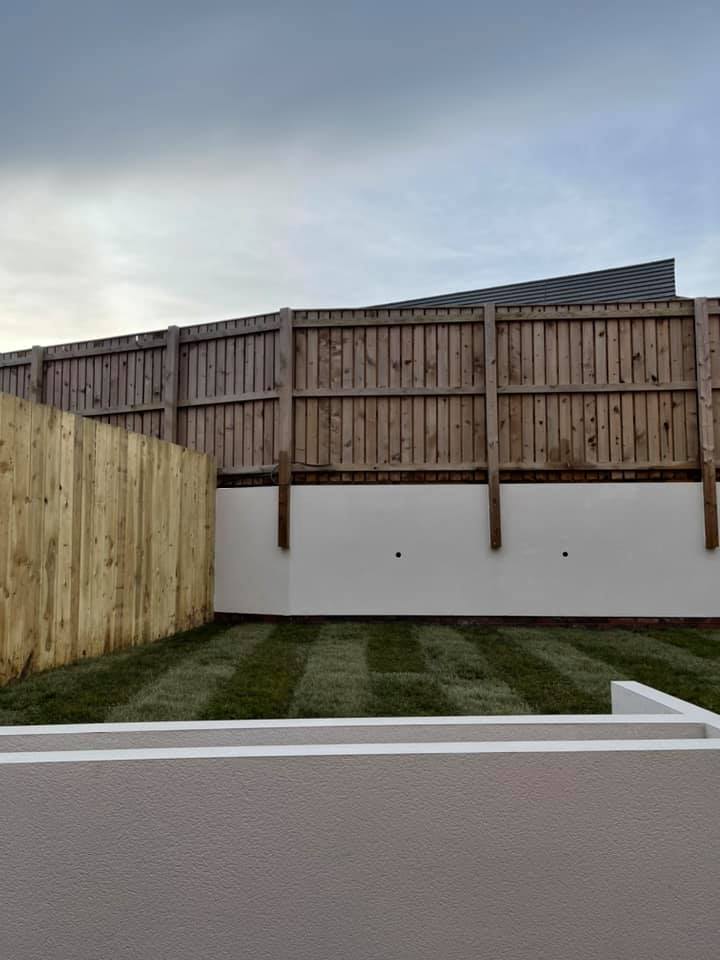 Another full garden transformation by the MIDD Construction team! Everything is done by our in-house skilled tradesmen! The complete package! Brilliant white rendered retaining wall, freshly laid turf, with grey sandstone paving to finish on the bottom patio, with 6ft fencing either side of the property.